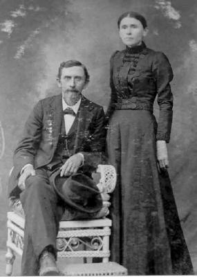 Addison Purifoy Whitford and Permelia Catherine Toler Whitford. He has a goatee beard and mustache and is sitting in a white chair with a hat in his hand, legs crossed. She stands behind wearing dark dress.